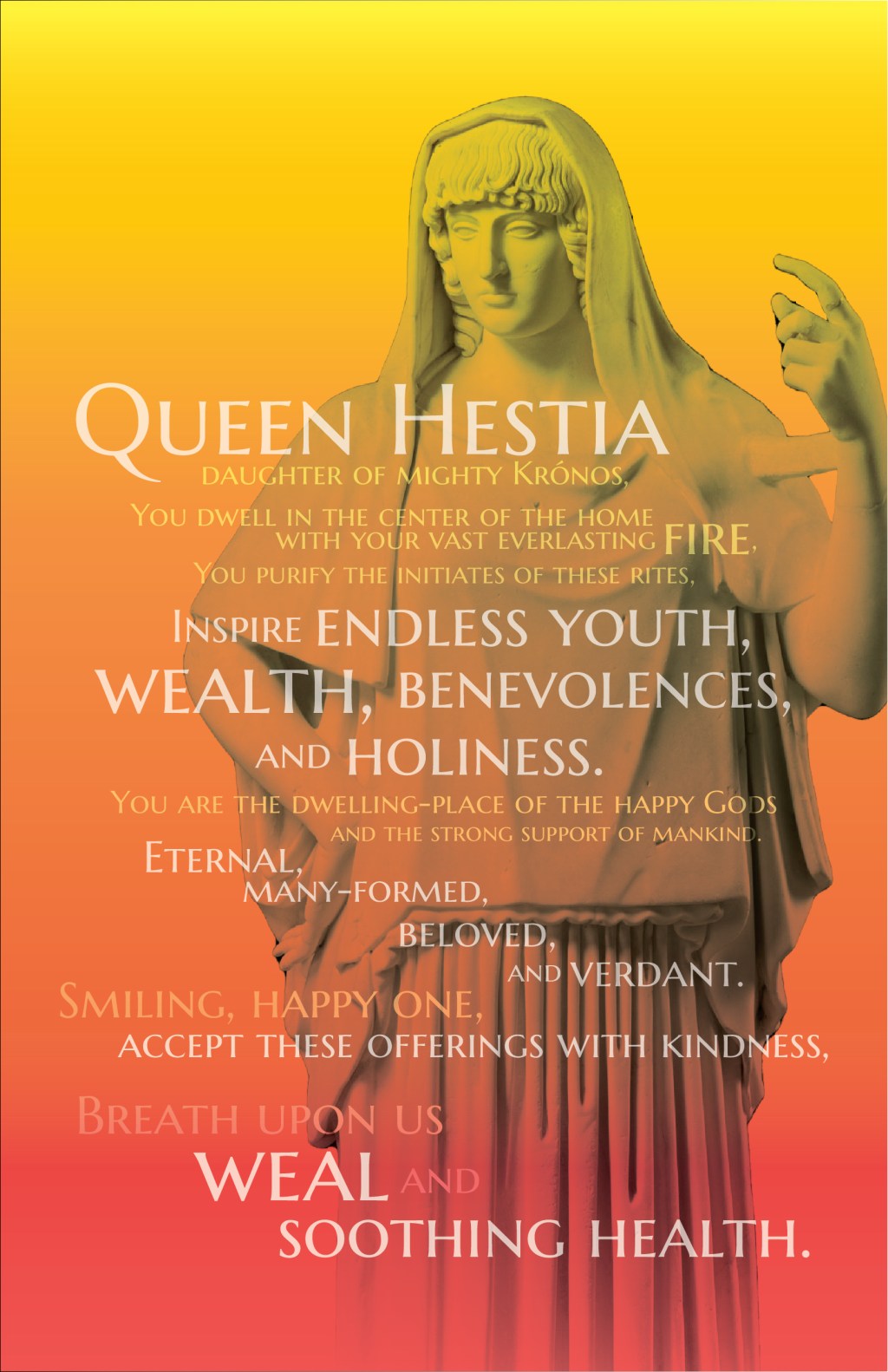 Hestia, from the Ancient Greek pantheon, is the Goddess my family and I venerate in our home. We are contemporary Pagans and we dedicate our main prepared meal of the day to Her. This poster hangs in our kitchen above where I hang my apron, and I recite the hymn every time before I put it on to cook for my family.